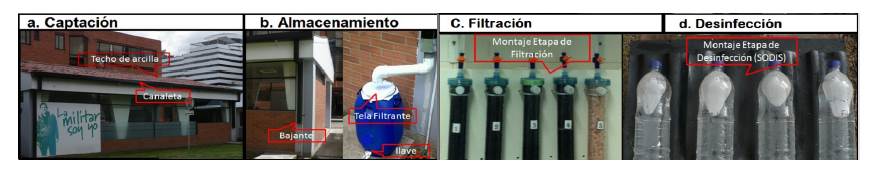 El sistema de recolección consistió en una canaleta y una bajante que conducían el agua hasta un tanque de almacenamiento de 60 litros de capacidad (Figura 1 a-b). En la parte superior del tanque se colocó una tela tipo muselina, que actuó como primer filtro del sistema, removiendo hojas y desechos de animales. El agua, una vez recolectada, era almacenada y caracterizada. En la Tabla 1 se observan los ensayos realizados siguiendo los métodos descritos por la American Public Health Association (APHA) [17]. Vale la pena indicar que estos parámetros son los establecidos por la Resolución 2115 de 2007 del Ministerio de Protección Social y del Ministerio de Ambiente, vivienda y Desarrollo Territorial de Colombia, para determinar si el agua puede ser utilizada con fines de consumo humano.