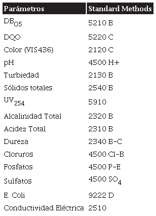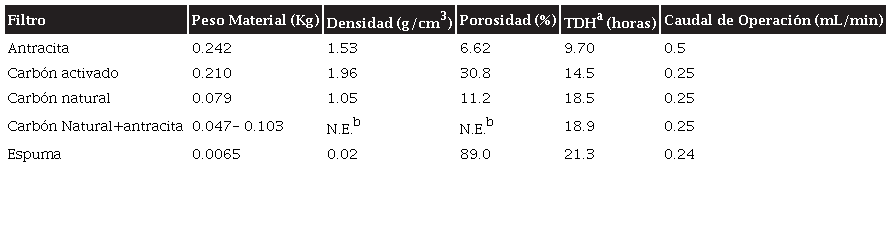 Los filtros fueron hechos en acrílico, con diámetro de 42 mm, largo de 250 mm, lo que resulta en una relación largo/diámetro L/D de 5,95. En el interior de cada uno de ellos se colocó primero la espuma con espesor de 32 mm; luego el material filtrante, que se compacta en 3 capas hasta alcanzar una altura de 218 mm, y en seguida se selló herméticamente con la tapa. Todos los filtros fueron caracterizados en laboratorio y se obtuvieron diferentes cantidades de material, propiedades físicas y tiempos de detención hidráulica que se pueden observar en la Tabla 2. Con el fin de comparar el desempeño de cada uno de los filtros se evaluaron nuevamente los parámetros de calidad mencionados en la Tabla 1.