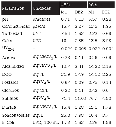En la Tabla 3 se presentan los valores medios del agua lluvia con tiempos de almacenamiento de 48 y 96 h. Los resultados indican que el almacenamiento, a las 48 horas y 96 horas, influye de manera notoria, por decantación, en las concentraciones de turbiedad, DQO, cloruros y solitos totales. Por tanto, se evidencia que almacenar el agua lluvia por 96 horas puede mejorar la calidad del agua, si bien existe el riesgo de presentar una mayor concentración de microrganismos y bacterias, lo cual se debe tener en cuenta para una posterior aplicación de los tratamientos seleccionados. Los tiempos de ocurrencia de eventos de lluvia influyen en la variación de los parámetros de calidad; por lo tanto, se recomienda que al implementar un sistema de recolección de agua lluvia se usen materiales que no degraden su calidad y que exista una limpieza constante en el techo, canaleta, bajante y tanque de almacenamiento.