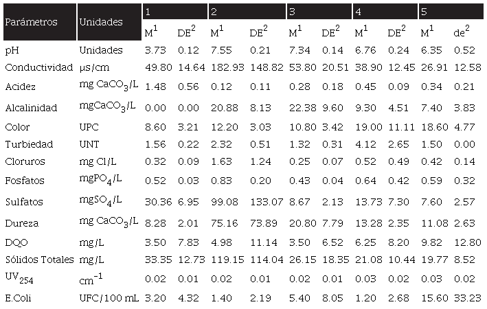 En general la calidad inicial del agua lluvia es aceptable, sin embargo, no puede ser considerada aún como potable. Inmediatamente después de un evento de lluvia, las muestras fueron caracterizadas, donde los valores medios de pH fueron de 6.61±0.37 unidades; los de conductividad, 27.7±18.0 μs/cm; alcalinidad, 9.63±5.3 mg/L; cloruros, 1.08±0.57 mg/L; sulfatos, 28±18.2 mg/L, y dureza, 14.1±3.12 mg/L. Estos valores se encuentran dentro del límite admisible establecido en la Resolución 2115 de 2007; sin embargo, en el caso del color (54.5±48.2 UPC), turbiedad (6.34±3.8 UNT), fosfatos (0.91±0.49 mg/L) y E. Coli (5.84±8.8 UFC/100 mL), los valores superan los límites permisibles establecidos. Por otra parte, la Resolución 2115 del 2007 no especifica los valores admisibles de acidez, UV254, DQO (Demanda Química de Oxígeno), DBO5 (Demanda Biológica de Oxígeno) y sólidos totales, los cuales presentan valores medios de 0.37±0.01 mg/L, 0.044±0.02 cm-1, 41.58±43.7 mg/L, 3.06±9.3 mg/L y 31.12±18.2 mg/L, respectivamente. Los resultados de la caracterización muestran que los parámetros más críticos y los que se consideran de difícil remoción son los sulfatos, la turbiedad y el DQO. En razón de lo anterior, la utilización de materiales para utilizar como lecho filtrante que contengan minerales de carbón, como la antracita y el carbón natural, resultan ser adecuados debido a su elevada superficie de contacto y capacidad de adsorción.