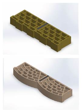 ECO-D2 proposes organic façades through its curved appearance. Its perforation geometry is irregular since the outer arch that delimits the air chamber is offset in distorted rectangular cells on its longest side to the interior surface of the piece. Both designs propose lateral flanges to isolate the thermal bridges generated by the mortar joints. Additionally, ECO-D is designed for combination with MB to create different façade patterns.