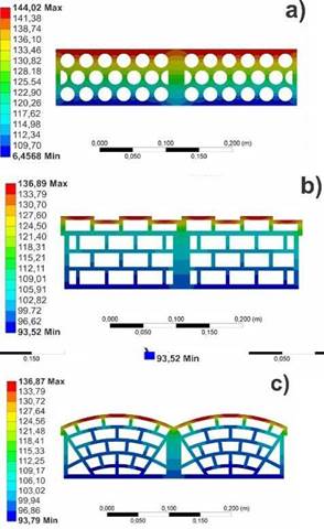 The bricks undergo interactions in alternate physical conditions such as fluids and heat loads. The external wind condition (convection: 5 Wm2.°C) and solar radiation (heat flux: 796.8 Wm2.°C) are applied to the front face, and the internal natural convection condition (convection: 25.903 Wm2.°C). is applied to the rear face and the faces of the ventilation chambers.