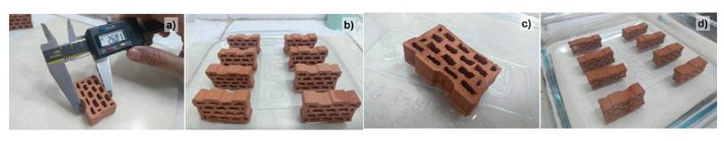 Technical validation comprises ECO-D1 manufacturing and the analysis of its physical and mechanical properties. Fig. 4 shows the photographic record of some tests performed on the samples, such as the determination of dimensions, efflorescence, initial water absorption rate by capillarity, and water absorption by immersion in cold water.