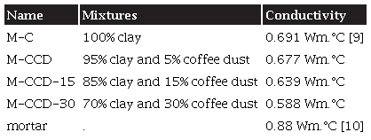 For conducting this process, the thermal conductivity data was supplied for standard clay bricks and cement mortar. Furthermore, alternative mixtures with organic waste in different percentages were used, modifying the thermal conductivity of the materials. The conductivity of materials used in this paper are described in Table 1.