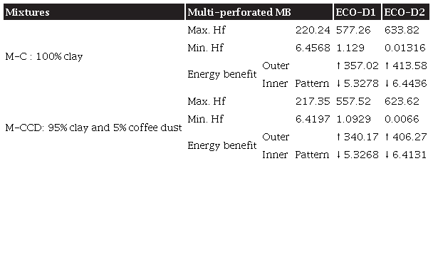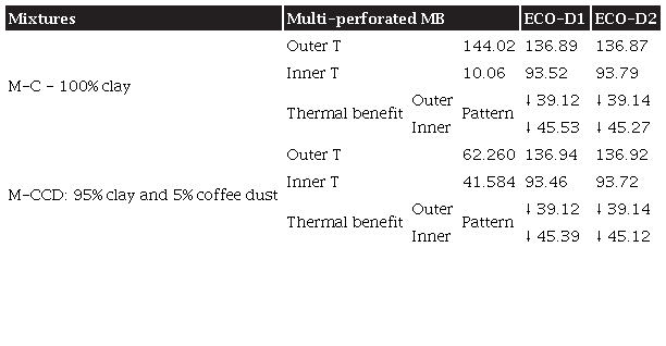 According to the simulation results, ECO-D1 was selected for the efficiency of its thermal behavior in the specified environmental conditions. For this reason, the behavior of this design in different mixtures was further explored. ECO-D1 was simulated in two other mixtures, and the clay sample was taken as a standard to compare the thermal benefit. The mixtures vary according to the percentage of coffee dust in the paste: M-CCD 15% (85% clay and 15% coffee dust) and M-CCD 30% (70% clay and 30% coffee dust), as shown in Table 5.