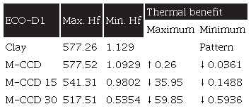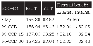 The percentage variation of organic material in the mixture does not represent a considerable thermal benefit compared to the thermal benefit obtained from the innovative shape. Oddly, as seen in Table 6, in the design's outer surface temperature (minimum) increases, but the inner surface temperature decreases between 32.06 and 32.48 °F. M-CCD 30% is the best result, which only increases the thermal benefit by 32.48°F on the design's interior surface.