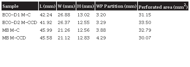 Tables 7 and 8 summarize the values of ECO-D1 dimensions of length (l), width (w), weight (h) and width of partition (wp) and properties, such as linear shrinkage (ls), mass losses, mechanical Table 7. Dimensions resistance to compression, efflorescence, porosity, bulk density and water absorption [12]-[16]. Likewise, Tables 7 and 8 contrast MB values.
