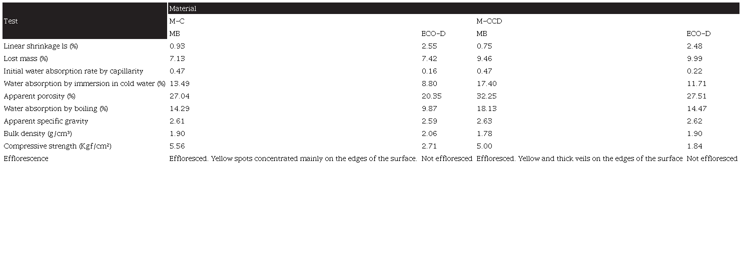 The general, dimensional, thermal, technical, construction, and regulatory characteristics of the ceramic product are described and illustrated in a technical sheet. According to Table 6, the linear shrinkage in MB, in both mixtures, have lower values than ECO-D1, which means that the samples of ECO-D1 in M-C and M-CCD are more prone to fissures and firing pathologies due to the higher values of LS. This finding is related to the compressive strength values since; ECO-D1 is less strong than mb, and water absorption capacity.