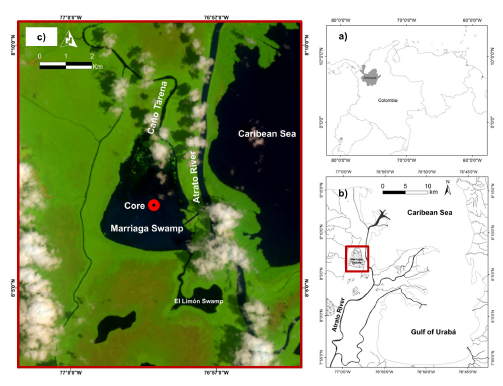 The climate of the last millennium has been widely investigated worldwide. However, some tropical lacustrine settings remain unexplored. That is the case of swamps in the Atrato River delta in Colombia, in which paleoenvironmental reconstructions are limited to characterizations based on water, surface sediments, or shallow cores (< 80 cm) [13]-[15]. This study focuses on the flood plain area of the Atrato River, considered one of the most important rivers of western Colombia, with more than 20 lacustrine systems spread along its vast flood plain [13]. The Marriaga Swamp is the northernmost lacustrine landform of the Atrato River delta (8° 06' 70" N; 76° 58' 28" W; 15 m.a.s.l.) with a surface area of 12.47 km2 and a maximum water depth (measured during this research) of 4 m (Fig. 1). The swamp is connected to two main streamflows: the Atrato River to the west and the Caño Tarena to the north. The area has a tropical climate corresponding to the Intertropical Convergence Zone (iTCz) with average annual rainfall from 2,500 to 3,000 mm [16]-[17]. The average temperature is estimated at 33.8 °C. Humidity ranges from 80 to 86 % throughout the year [18].