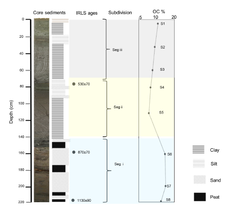Organic matter content is present in the core, with values ranging between 7.8 and 12.5 %. In the oldest segment (Seg. i), the organic matter content is considerably high, as evinced by four peaty layers. These layers indicate exposure conditions that allowed vegetation cropping between approx. 1,130 ± 90 and 870 ± 70 a. In Seg. ii (between 870 ± 70 and 530 ± 40 a), the organic matter is low and relates to a sedimentary sequence of clay that indicates subaerial and redox conditions. The coarser sediments in the most recent segment (Seg. iii) indicate the influence of high-energy flows feeding the swamp. Seg. iii is characterized by an increase in organic matter content towards the surface, approx. 530 ± 40 a to present. However, Seg. iii resembles Seg. ii in terms of grain size and the absence of clear peaty layers, except for milli-metric laminations.