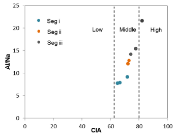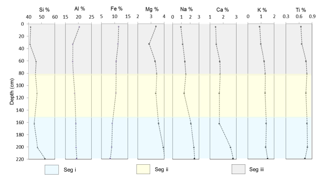 Si, Al, Fe, Mg, Na, Ca, and K are associated with a siliciclastic provenance (Fig. 3). Seg. i (lower part of the sequence) has high Si, Mg, Na, Ca, and K concentrations, whereas Seg. ii (middle of the sequence) shows an increment of Fe and a reduction of Mg and Na. Seg. iii (upper sequence) exhibits high Al and Mg concentrations and reductions in Si and Ca. The patterns of Ca and Mg are more complex, probably due to the variety of bedrock sources with detrital and endogenic inputs.