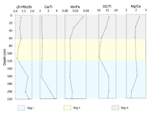 The (Zr+Rb)/Sr ratio reveals terrigenous inputs, whereas the Ca/Ti ratio indicates carbonate production [26] and the relation with drought in humid conditions. High (Zr+Rb)/ Sr and Ca/Ti imply possible drought conditions observed in Seg. i (220 to 160 cm) from 1,130 ± 90 and 870 ± 70 a, with a significant fall towards more recent sediments. A relatively constant humid environment is consistent with these low ratios observed in the upper 120 cm of the core (Seg. ii and Seg. iii).