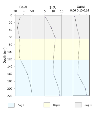 Carbonate precipitation (Fig. 5.), interpreted from Ba/Al, Sr/Al, and Ca/Al ratios, shows high Ba/Al profile values in Seg. i (220-120 cm), with a notable increase in the sequence's upper sediments, suggest authigenic processes. The presence of ion-rich waters and chemical precipitation is interpreted from Sr/Al and may indicate a saline, brackish stage in the Marriaga Swamp from 1,130 ± 90 to 530 ± 40 a (220-60 cm), with clear decreasing values from 60 cm to surface.