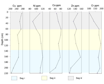 The upper sequence (Seg. iii) is the clearest sedimentary section representing more humid conditions and fluvial influence, with a significant drop of detrital Si, rise of Al, and moderate presence of Na and Ca. A rise in biological productivity is inferred by high Fe concentrations and Mg/Ca ratios. However, the tidal influence is represented by high Ba/Al ratios towards the lowest part of the sequence (< 25 cm). Concentrations of heavy metals also prove an increase of Cu, Ni, and Zn for Seg. iii, possibly related to human activities such as mining, whereas the reduction of Cr and Co could be interpreted as the influence of intense weathering and dilution of natural sources for these two metals.