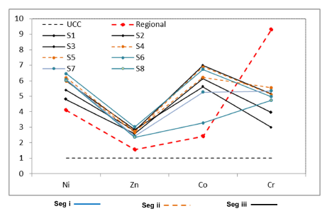 Cu, Ni, Zn, Co, and Cr concentrations were normalized with average Upper Continental Crust (UCC) concentrations [31]-[32] and compared to regional background data (Fig. 7) from stream sediments sampled by the Geological Survey of Colombia upstream the Marriaga Swamp in the Atrato River [33]. The purpose of this normalization was to determine if the heavy metal concentrations in the Marriaga Swamp showed extreme thresholds.