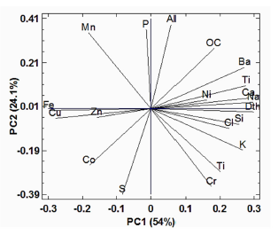 A Principal Component Analysis (PCA) of the variables OC, depth, major elements, and trace elements (Fig. 9) reveal that PC-1 explains 54 % of the total variance and is positively linked to Al, OC, Ba, Na, Mg, Ca, Si, Cl, K, Ti, Cl, and depth and negatively linked to Fe, Cu, Zn, Co, and S. PC-2 accounts for 24.1 % of the total variance and is positively linked to Mg and P and negatively linked to Cu, Zn, Co, S, Cr, Ti, K, Cl, and Si.