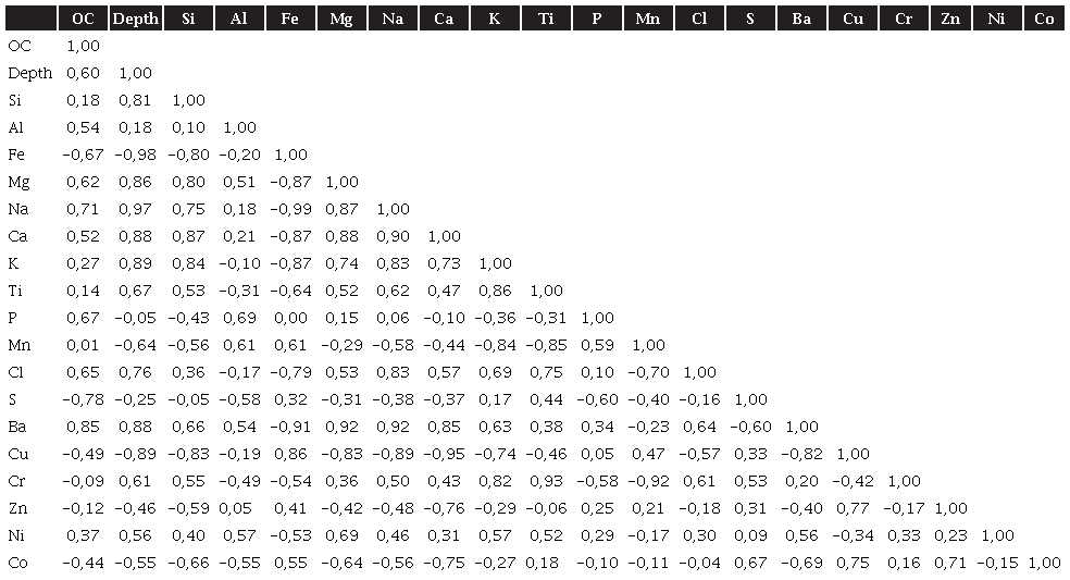We applied a Pearson correlation to identify the statistical significance association (r > 0.70; p-value > 0.05) between OC, depth, major elements, and trace elements (Table 2). The results can be clustered in three main groups: 1) OC has a positive correlation with Na and Ba, concerning organic features and biological productivity, 2) Si, Fe, Mg, Na, Ca, K, Ba, Cl, and Cu are positively correlated with depth, concerning the interpretation of bedrock components, and 3) Cr, Zn, and Co, related with heavy metal inputs.