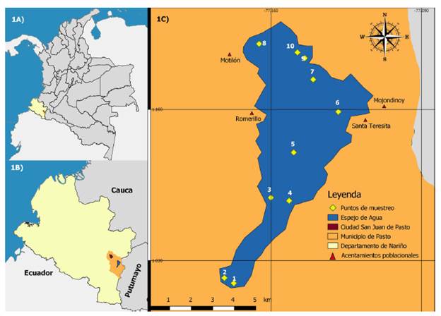 El lago Guamués (LG) se encuentra a 2765 msnm, al suroeste de San Juan de Pasto, capital del departamento de Nariño (figura 1a-b) [38], [39]. Es un lago altoandino, localizado a lo largo de la falla tectónica de Algeciras, fenómeno geológico que, a su vez, se extiende entre los departamentos del Putumayo, Nariño, Caquetá, Cauca, Huila y Meta [40]. El LG es un importante cuerpo de agua que hace parte de la cuenca alta del río Guamués, su localización geográfica presenta las siguientes coordenadas: 0°50", -1°15" latitud Norte, y 77°05", -77°20" longitud Oeste [41].