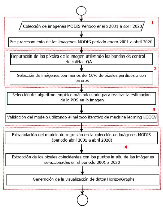Una vez obtenida esta información, se extrajeron vectores temporales coincidentes con las coordenadas geográficas de los puntos de muestreo; además, utilizando rutinas computacionales del lenguaje de programación Python y R se generó la visualización de datos HorizonGraph (HG) para el periodo 2001-2020.