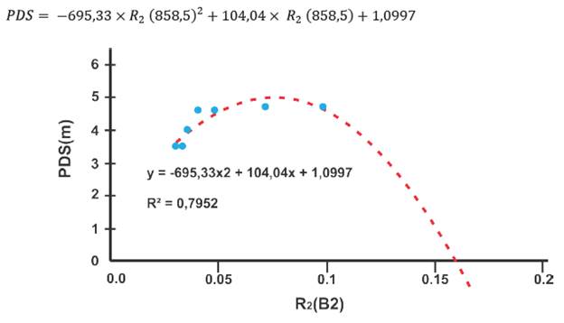 La banda centrada en los 858,5 nm (banda 2) tiene una aplicación más práctica en la estimación del total de los sólidos en suspensión en aguas interiores [32]-[34]. Sin embargo, esta misma longitud de onda puede ser utilizada en la derivación de valores de la PDS, teniendo en cuenta que la turbidez del agua está directamente relacionada con las medidas que pueden obtenerse con el disco de Secchi [33], [35]-[37].