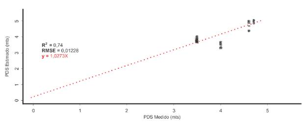 Una vez probada la validez del algoritmo basado en la banda 2 del sensor MODIS, fue modelado en términos matemáticos (ecuación 2) y representado gráficamente (figura 3). Asimismo, la validación del modelo presentada en la figura 4 muestra la dispersión de los valores de PDS estimados y observados obtenidos a partir del procedimiento LOOCV.
