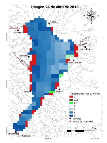 Generalmente, la variabilidad en la calidad del agua en un lago no uniforme es fácilmente visible a través de imágenes derivadas de sensores remotos (figura 5). Esta imagen MODIS coincidente con la fecha del trabajo de campo de abril de 2013 se utilizó para producir un mapa que muestra la dinámica espacial de la PDS sobre la superficie del lago Guamués. En esta figura, se revela que, aun siendo la resolución espacial de 250 m para los píxeles del sensor MODIS, fue posible captar la homogeneidad que el lago presenta en gran parte del espejo de agua, así como las zonas que presentan niveles que indican la existencia de un gran flujo de sólidos en suspensión, llevados al lago por algunos cursos de agua de magnitud considerable.