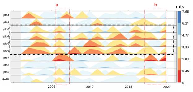 Los periodos en que se observa disminución de los valores de la PDS están resaltados en líneas discontinuas rojas. En la serie del tiempo, se observan dos periodos con valores menores del promedio en 2005-2007 (a) y 2017-2020 (b). Estos momentos de bajo PDS se hacen más notorios en la estación de muestreo siete, donde para los periodos indicados se tiene un PDS menor a 0,42 m. Otro punto con alta variabilidad es el seis, pero la oscilación dentro de esta estación de muestreo está en 1,2-3,0 m.