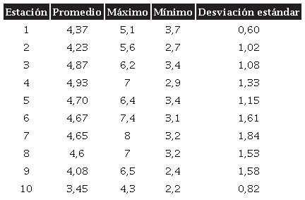 Otros puntos que presentan valores oscilantes entre 1,5 y 3,2 m son los puntos cuatro y cinco. Los restantes puntos de muestreo indican lecturas homogéneas con poca variabilidad, con una PDS promedio de 3,9 m.
