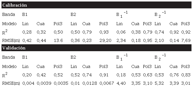 A partir de los datos de la tabla 2, se observa que los modelos lineales presentan desempeños modestos en los estimadores estadísticos R2, sobre todo, los errores asociados al modelo predictivo que, en algunos casos, llegan a superar los 5,32 m en el RMSE. Por otra parte, los modelos basados en polinomios de tercer grado muestran un R2 para la banda 2 superior a 0,9. Sin embargo, el RMSE es muy alto, pues, en algunos casos, alcanza los 29,2 m.