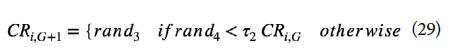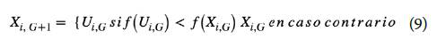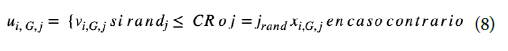 donde CR es la tasa de cruce e indica qué porcentaje del vector mutante y del vector objetivo (xi,g,j ) formará parte del vector de prueba. El rango para CR es de 0 a 1.