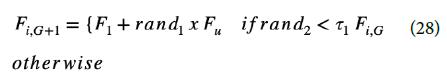 donde Τ1 y T2 tiene un valor de 0.1, Fu=0.9 y F1=0.1. Los valores de CR varían entre [0,1]. Rand1 y rand2 son valores aleatorios entre 0 y 1 que siguen una distribución uniforme. El tamaño de la población debe ser definido por el usuario mediante prueba y error. Dado que depende de la complejidad del problema.