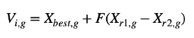 Donde Vi,g = Vector mutado, F = Factor de mutación, Xri,g= Vectores aleatorios de la población inicial y Xbest,g= Vector con mayor costo en la población en la generación g. El valor del factor de mutación definido por el usuario afecta la calidad de la solución y la velocidad de convergencia.