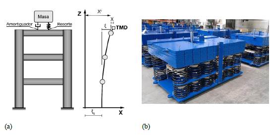 De forma ideal, un amortiguador de masa sintonizada (TMD) está constituido por un elemento de masa que se conecta a la estructura principal a través de un elemento tipo resorte y otro tipo amortiguador viscoso como se observa en la figura 1a. Actualmente, estos dispositivos son producidos a nivel industrial como aquel presentado en la figura 1b de la empresa Maurer.