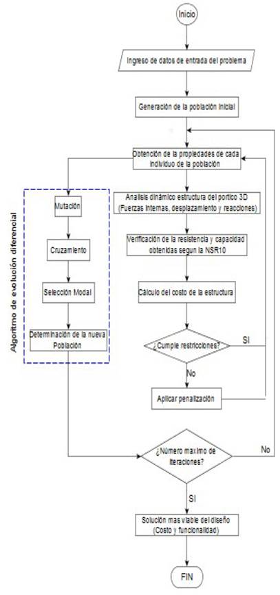 En primera instancia, el algoritmo requiere que el usuario suministre tanto las características de la edificación (dimensiones, cargas, base de datos de perfiles, rango de valores del TMD, sismos de análisis) como los parámetros del DEA (CR, F, NV, NMG). A partir de esta información, se inicializa la primera población de soluciones que consiste de NV pórticos regulares de acero equipadas con TMDS. Estos presentan configuraciones estructurales (perfiles y propiedades del TMD) diferentes. Para cada estructura se debe determinar la respuesta sísmica máxima (desplazamientos, derivas, fuerzas internas). Para el conjunto de sismos definidos por la amenaza mediante un análisis dinámico cronológico lineal, se adoptan 3 registros. Seguidamente, se evalúan las restricciones de comportamientos locales (elementos) y globales (estructura) y se calcula el costo de cada configuración estructural. Si una configuración estructural no cumple con al menos una restricción, se procede a penalizar el costo de dicha configuración con el objetivo de que pueda ser descartada por el proceso de optimización.