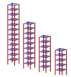 Para mostrar el desempeño de la metodología propuesta, se presentan los resultados correspondientes a la optimización de cuatro edificaciones en estructura metálica, regulares, compuestas de una luz de 3.00 m en ambos sentidos (X y Y), de 5, 7, 9 y 12 pisos con una altura de entrepiso de 4.00 m (ver figura 3). El material de los perfiles presenta límite de fluencia de 345 MPa, módulo de elasticidad 200,000 MPa, resistencia a la tracción de 450 MPa, peso específico de 7850 kg/m3. Respecto al TMD, se asumieron las propiedades presentadas en el trabajo de Meza y Manrique [16]. En cuanto a las cargas utilizadas, se consideró el peso propio de los elementos estructurales, la placa de entrepiso con un espesor de 0.20 m y la fuerza sísmica. Para la fuerza sísmica se tomaron los acelerogramas de los sismos de Lomaprieta (sismo 1), Coalinga (sismo 2) y El Centro (sismo 3) escalados a una aceleración de 0.35g. Estos sismos se asumen como representativos de la amenaza en el lugar de construcción. Siendo que debe ser definida la amenaza para el sitio de construcción.
