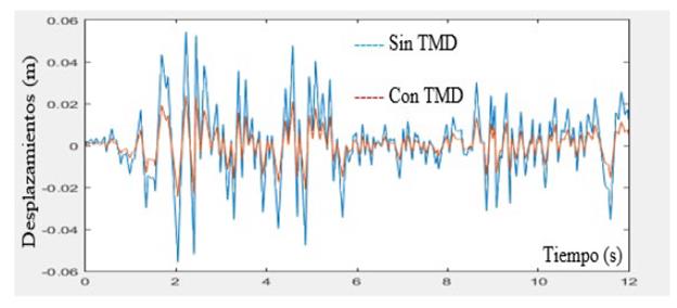 Igualmente, la relación óptima de la masa del TMD no presenta un valor similar independiente de la estructura. Lo cual indica que para diseñar una estructura con TMD en particular, se debe hacer por lo mínimo un proceso iterativo donde se varía tal relación. Respecto a la solución sin TMD, se observa un incremento del costo inicial en la mayoría de los casos. Siendo que para la estructura de 12 pisos no se cumplió con la restricción de derivas máximas, tornando esa solución inviable. Es importante resaltar que el desempeño sísmico de la estructura con TMD sería mejor que el que presenta su correspondiente sin TMD. Teniendo en cuenta los perfiles y la relación de masa obtenida por medio de la metodología de optimización, en la figura 4 se muestran los desplazamientos máximos generados en edificio de 7 pisos, con la configuración establecida. Así, se puede observar cómo los desplazamientos disminuyen significativamente en un 38% cuando se acopla el TMD a la estructura con una relación de masa de 2.2 %. Obteniendo unos desplazamientos máximos sin TMD de 0.058 m y con TMD de 0.024 m.