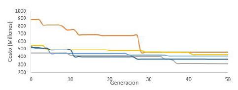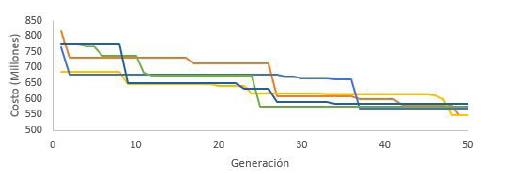 Al finalizar todas las estructuras en la población actual, la solución de menor costo en la población corresponderá a la mejor solución para la generación actual. Una nueva población es generada mediante las operaciones del algoritmo DEA establecidas en la sección 2 junto con las modificaciones presentadas en la sección 4.2. Se predefine un número máximo de iteraciones como criterio de paro en la base de pruebas preliminares sobre la cantidad que permite garantizar la convergencia. La solución final del algoritmo DEA debe ser el resultado de ejecutarlo en un número determinado de veces dada su naturaleza estocástica. Debe verificarse que la solución óptima satisfaga todas las restricciones del problema.
