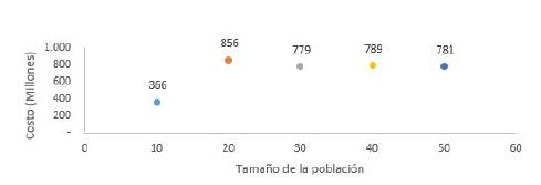 En las figuras 7 y 8 se muestran los resultados del proceso de optimización para las edificaciones de 7 y 9 pisos, respectivamente, cuando se varía el número de vectores de la población. En ambos casos, para poblaciones de 10 individuos se obtienen respuestas que, aparentemente, son económicas pero que no cumplen con todas las restricciones. Por lo tanto, no pueden ser consideradas como viables. Se puede considerar entonces que se puede utilizar un número de vectores de 30 para los edificios. Dado que al aumentar el número se consigue solo una reducción en el costo baja (aproximadamente 5% en el mejor de los casos). Es importante anotar que las cifras reportadas en las figuras 7 y 8 no son absolutas dada la naturaleza estocástica del problema.