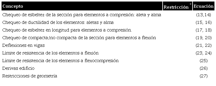 Las restricciones para el problema en estudio vienen desde aspectos funcionales y constructivos. La estructura principal debe ser diseñada para cumplir con los requisitos dados en el capítulo F del Reglamento Colombiano de Construcción Sismo Resistente NSR-10 [13]. En este caso, se supone que la estructura se encuentra ubicada en una zona de amenaza sísmica intermedia. Razón por la cual se consideran los lineamientos del reglamento para estructuras con capacidad moderada de disipación de energía DMU. Sin embargo, es importante anotar que se considerará que la estructura principal permanece en el rango elástico para la amenaza del lugar. La tabla 1 muestra todas las restricciones definidas para el problema, donde b: aneho de aleta, tf: espesor Aleta, h: altura de alma, tw: espesor de alma, k: rigidez, L: longitud efectiva, r: radio de giro, Δ permisible= L/360 Pu = resistencia de compresión axial requerida, Pn = resistencia de compresión axial disponible. Mu = resistencia de flexión requerida, Mn = resistencia de flexión disponible en la dirección de análisis. (X eje fuerte. Y eje débil) Φ = factor de resistencia. 0.90. Δimax:. deriva máxima, "hpi : altura de piso. sci= sección de la columna del piso. Sei-1= sección de la columna del piso inferior.