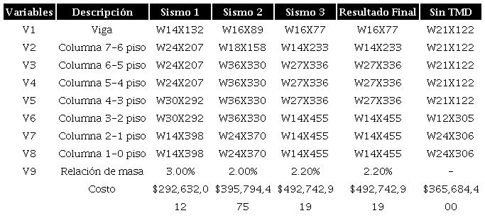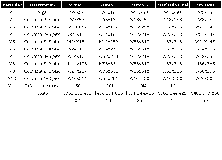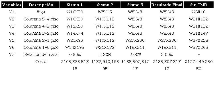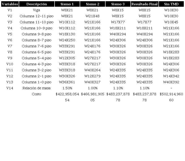 Las tablas 2 a 5 presentan la solución encontrada mediante la metodología propuesta para cada una de las edificaciones analizadas. En dichas tablas, se reporta la configuración de perfiles y la relación de masa del TMD obtenidas para cada uno de los sismos analizados. Así como el diseño final de la estructura a aquella configuración estructuralmente más robusta. Adicionalmente, se hace la optimización del pórtico sin TMD para efectos de comparación con la solución estructural, incluyendo la protección sísmica. Considerando un R=7 para el diseño de esta estructura. Puede observarse que en función del sismo utilizado las configuraciones estructurales obtenidas pueden variar significativamente, produciendo diferencias en costos mayores al 50%.