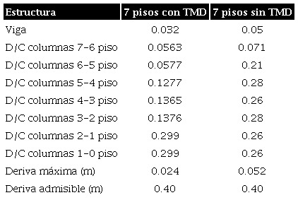En la tabla 6, se muestran los resultados de la relación demanda-capacidad de cada uno de los elementos estructurales (vigas y columnas) y derivas máximas que se obtienen con los perfiles generados en el proceso de optimización para la estructura de 7 pisos con TMD y sin TMD. La intención es corroborar que cumple con las solicitudes impuestas. Como se puede analizar, los perfiles obtenidos para la estructura sin TMD son menores a los de la estructura con TMD. Lo anterior, se debe a que en el proceso de optimización el algoritmo no encuentra una solución viable que satisficiera las restricciones. En este caso la deriva máxima no cumple con la admisible. Por el contrario, la estructura con TMD cumple con todas las restricciones en cuanto a capacidad y desplazamientos permisibles de la estructura. Por lo cual es la solución viable para el problema.