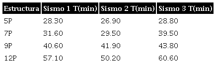 Debido al costo computacional y el número de ejemplos que se corrieron, se hicieron edificios de una luz en ambas direcciones. Ya que al aumentarle una luz más en ambos sentidos, incrementa el tiempo de corrida para el algoritmo en gran medida. Estos tiempos se aplican para una máquina Core I7 con 8GB de memoria Ram. Este aspecto aún requiere de atención con el fin de disminuir la exigencia computacional que se origina en la necesidad de realizar análisis dinámico cronológico lineal.