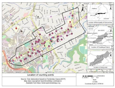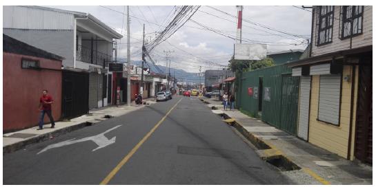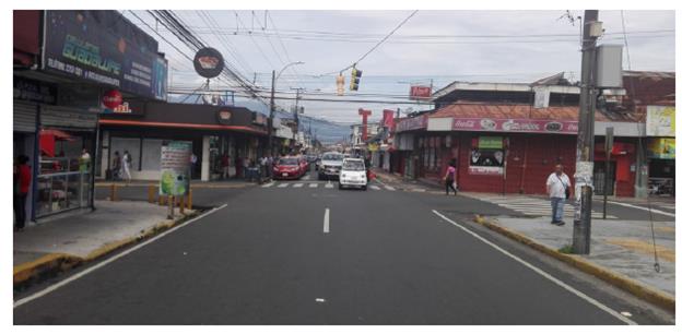 The study area comprises the Central Business District (CBD) of Guadalupe in the Municipality of Goicoechea, in the province of San Jose, Costa Rica. Guadalupe is one of the seven districts of Goicoechea. Statistics regarding Guadalupe and Goicoechea are in Table 1. This information can be helpful to evaluate the applicability of this research in similar cities outside Costa Rica. The district of Guadalupe was selected due to similarities to other urban areas in Costa Rica: a predominant commercial land use, its streets and avenues forming a grid, and the presence of sidewalks.