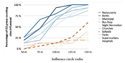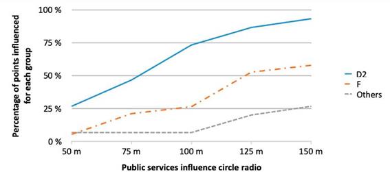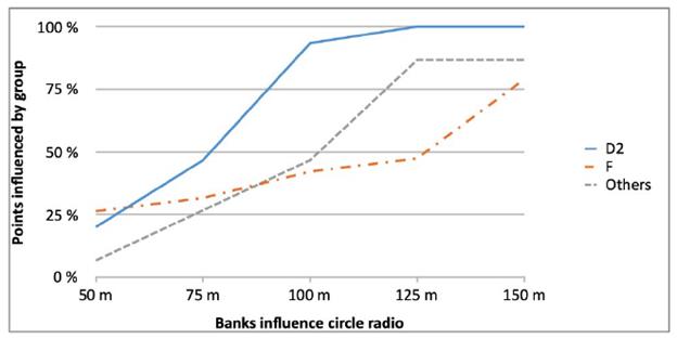 As shown in Figs. 12 and 13 for both banks and public services, the percentage of points influenced in each group increases concerning distance. In both cases, group D2 is the most influenced by them.