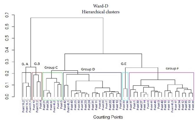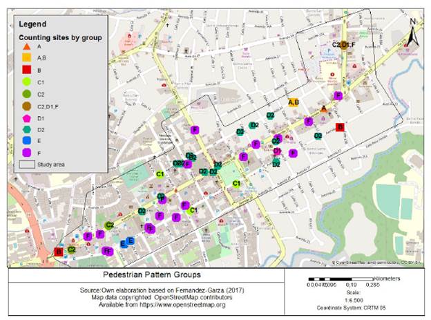 Fig. 4 shows the spatial distribution of the different pattern groups. Groups D2 and F have 15 and 19 counting sites, respectively, comprising more than two-thirds of the sites considered in the study. Groups A, C2, and E presented fewer counting sites on nearby locations.