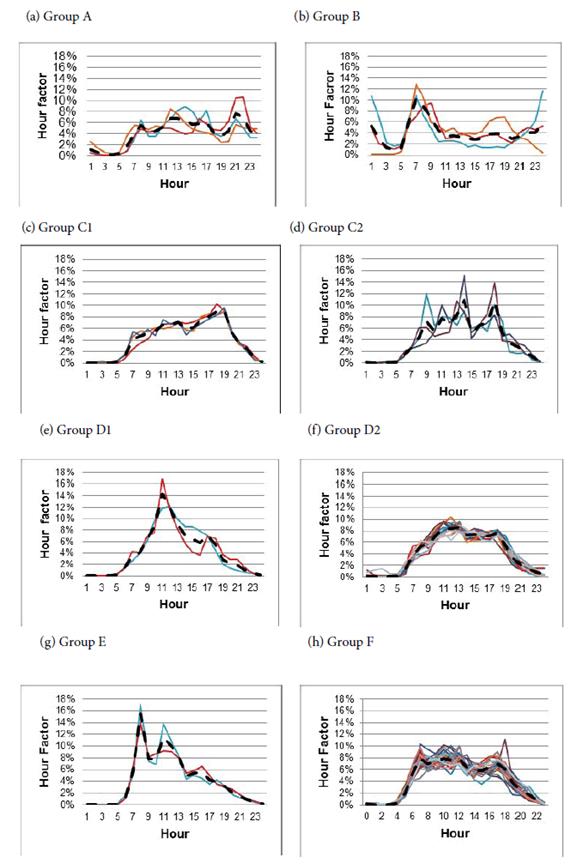Fig. 5 depicts the eight patterns obtained. Every graph contains the hourly distribution for the counting sites in the group. Additionally, the dashed lines represent the average value for each group. Table 3 shows the average hourly factors obtained for each group.