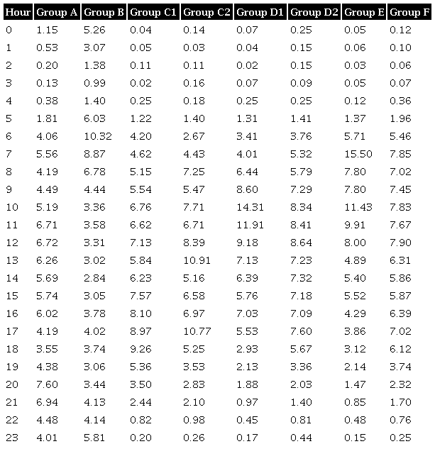 Group A: Sites 16.1, 16.2, and 22.1. This group does not present well-defined peak hours. Even though the counting site 16 was separated in two, the cluster analysis joined them due to the pattern differences between Mondays and Thursdays because these differences are less significant than the differences among other sites. There is a variation of traffic, around four percent of total daily traffic, between 8 am and 11 pm (Fig. 6).