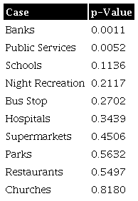 According to the results shown in Table 4, only for the case of banks and public services, the null hypothesis is rejected; that is, the established groups depend on the distance they are from the banks and public services.