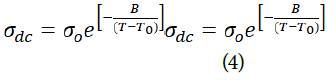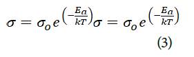 Donde σo es una constante del material. Ea es la energía de activación (KJ/mol/K) de los portadores de carga. k es la constante de Boltzmann (1.3 8 06x10-23 J/K)' y T es la temperatura absoluta (K). Para materiales amorfos, tales como conductores iónicos poliméricos, asfaltos y vidrios, la conductividad dc sigue un comportamiento VTF (Vogel-Tamman-Fulcher) dado por la ecuación 4.