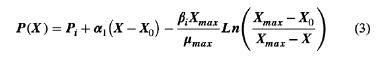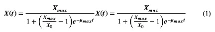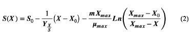 Modeling. The logistic, Pirt and Lue-deking-Piret equations can be used to obtain simpler ones to establish relationships between growth, substrate consumption, growth, and product synthesis. Eq. 1 is obtained by integration of the logistic equation, while eqs. 2 and 3 are obtained by dividing the Pirt, and Luedeking-Piret equations, respectively, by the logistic equation followed by integration, as demonstrated previously [20]:
